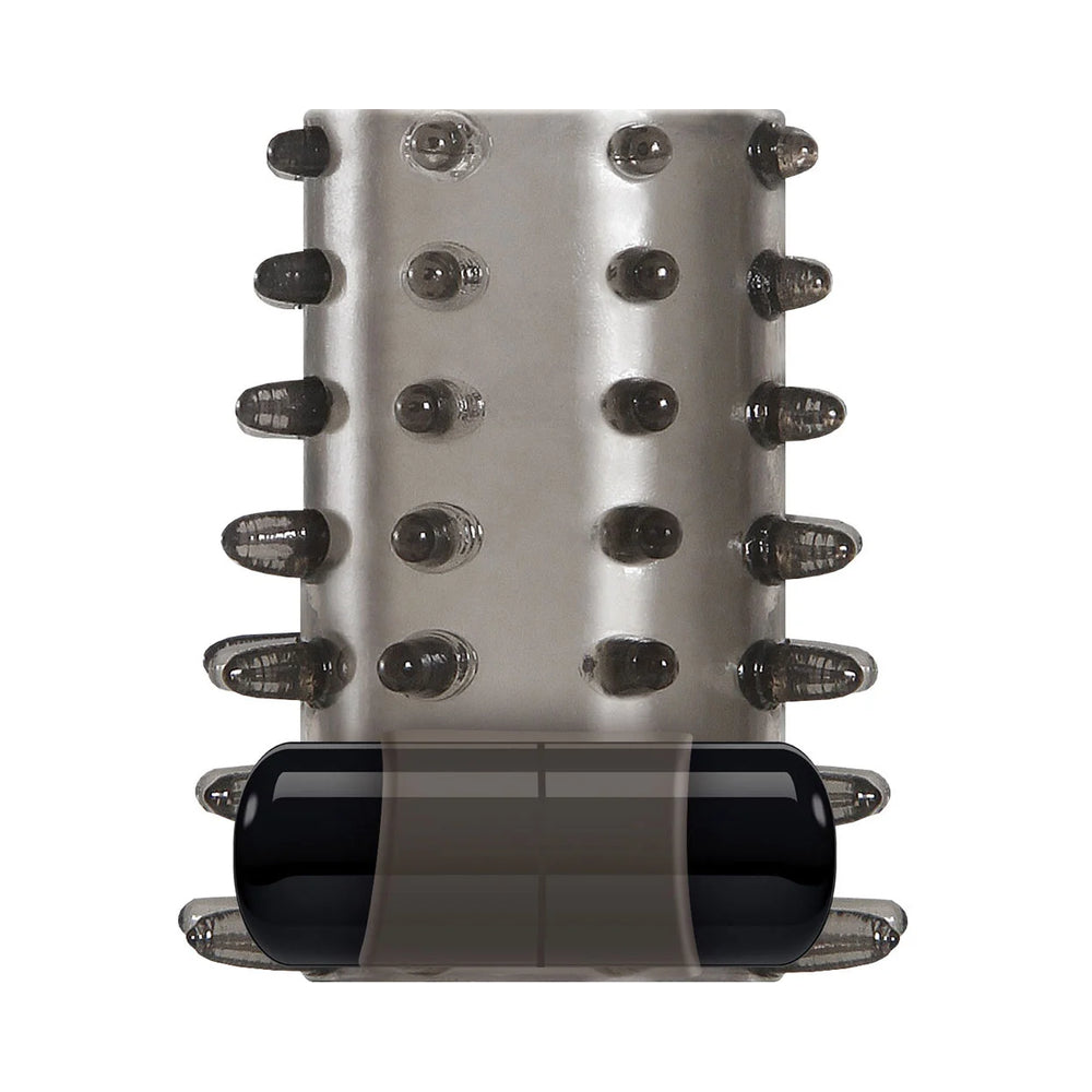 One Night Stand Penis Sleeve with Bullet Smoke from Evolved Novelties. 3 in 1 Couples Toy is Thermoplastic Elastomers TPE. Penis sleeve with nubs and protrusions for her pleasure. Package measures 2.01 inches by 4.01 inches. With bullet vibrator.